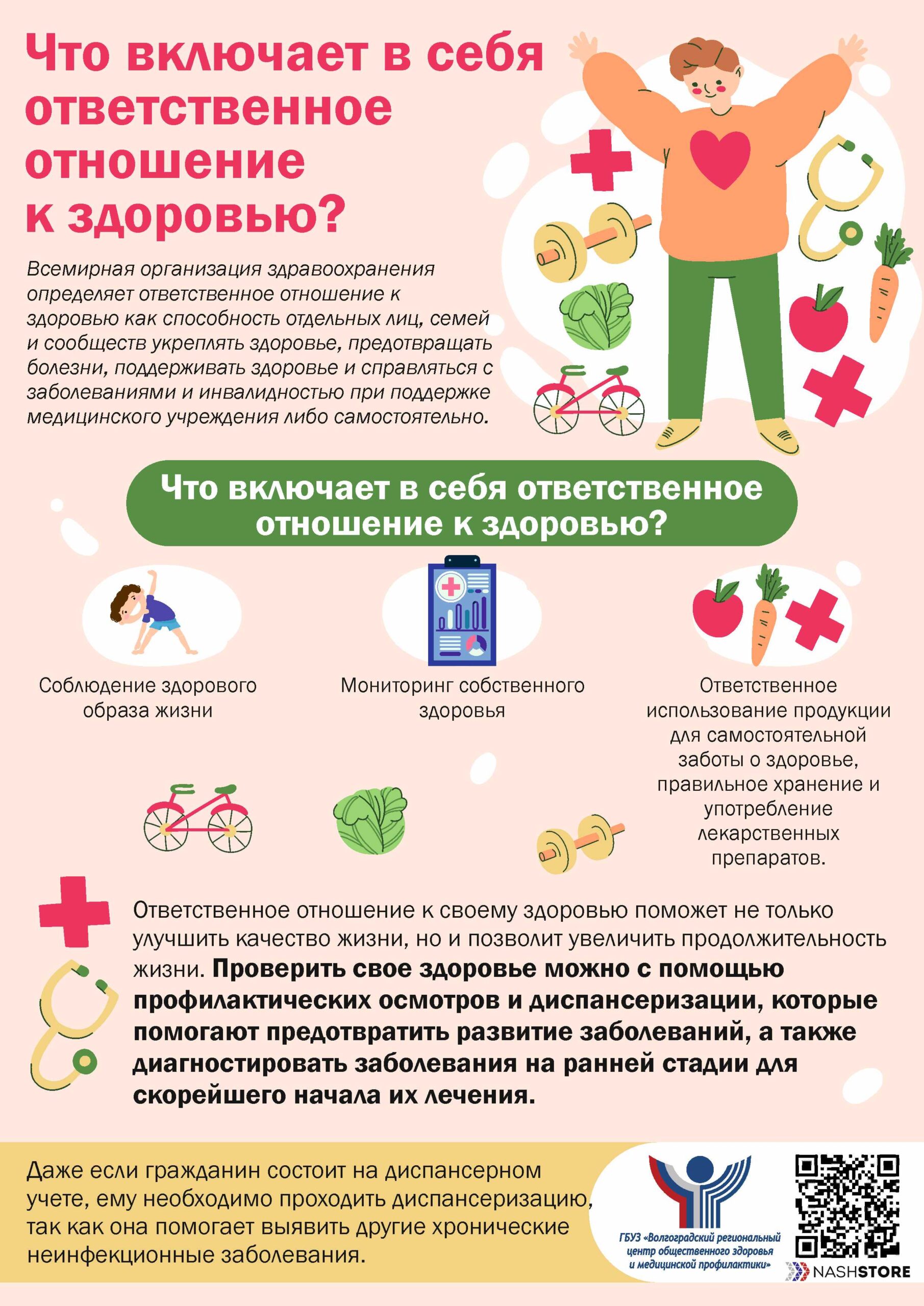 ВОЗ определяет ответственное отношение к здоровью как способность отдельных лиц, семей и сообществ укреплять здоровье, предотвращать болезни, поддерживать здоровье и справляться с заболеваниями и инвалидностью при поддержке медицинского учреждения либо самостоятельно.