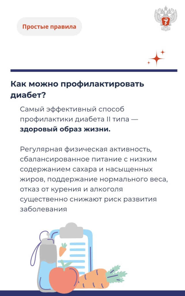 В профилактике сахарного диабета, как и многих других заболеваний, весомую роль занимает здоровый образ жизни — рациональное питание, регулярная физическая активность, отказ от вредных привычек.