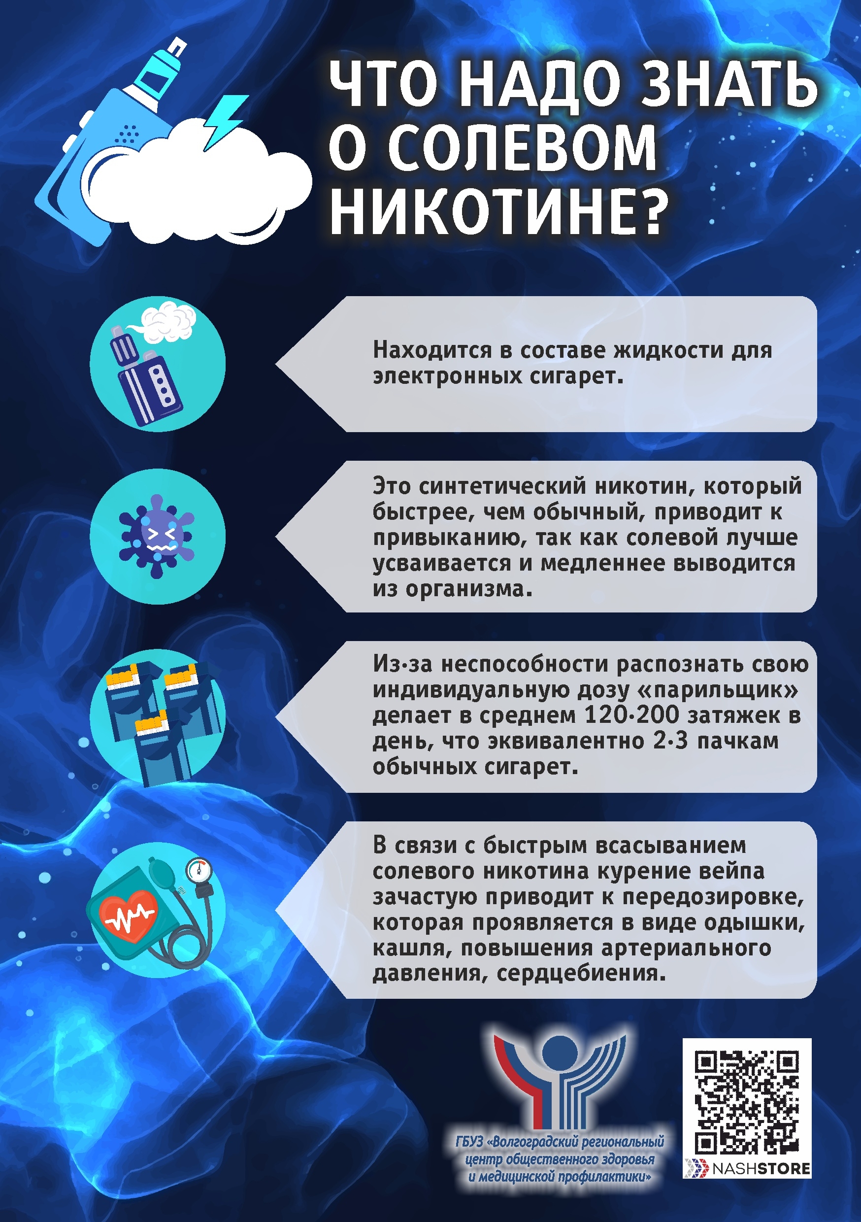 Солевой никотин (содержится в вейпах) — это никотин, уровень кислотности (pH) которого совпадает с уровнем кислотности (pH) организма человека. Солевой никотин получают путем добавления специальных кислот в обычный (щелочной) никотин. Для этого производители используют бензойную, левулиновую, молочную, яблочную и другие органические кислоты. Когда они вступают в реакцию с никотином, образуется соль. Она представляет из себя нейтральное соединение положительного заряда (кислоты) и отрицательного (основание). Солевой никотин быстрее усваивается организмом, чем щелочной.