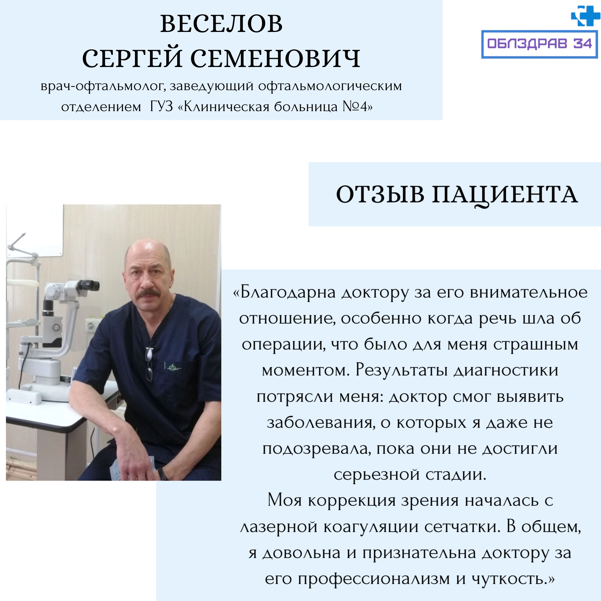 Сергей Семенович Веселов – заведующий офтальмологическим отделением 4 больницы, врач высшей квалификационной категории, победитель Всероссийского конкурса врачей-2023. Является ассистентом кафедры офтальмологии ВолгГМУ и наставником — на базе отделения проходят обучение ординаторы кафедры офтальмологии.