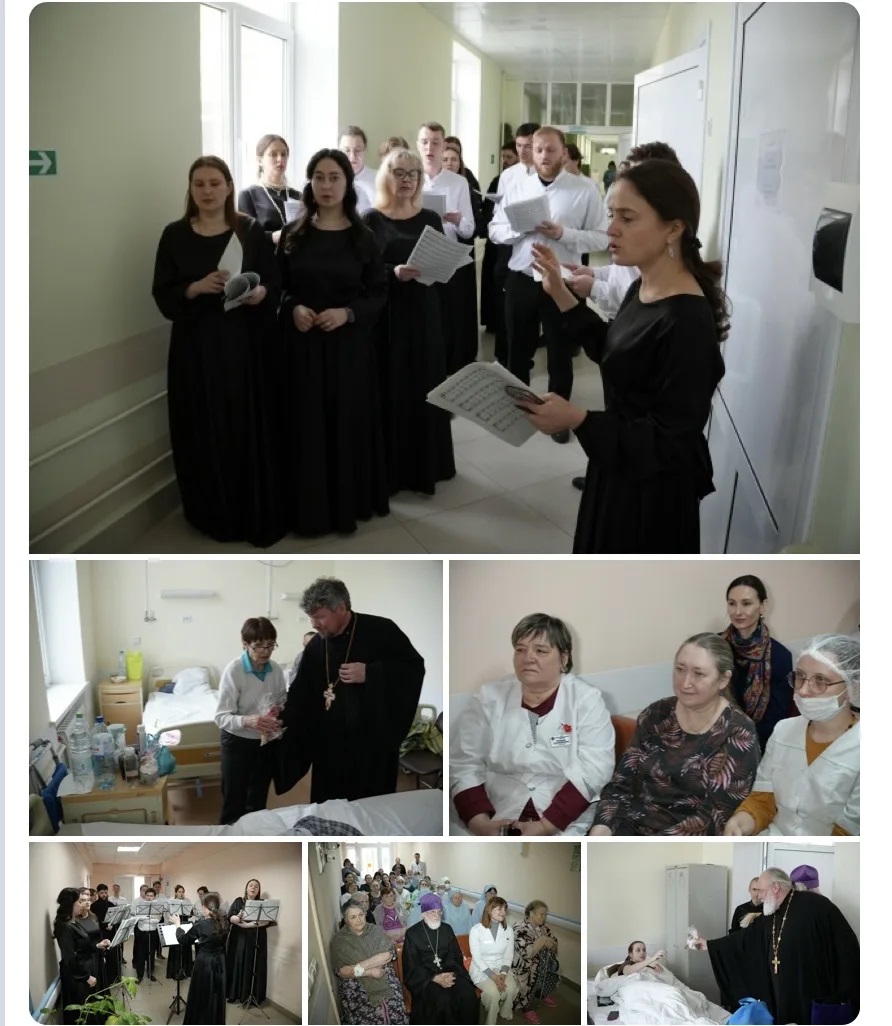 В холле кардиологического отделения прошел Пасхальный концерт. Слушатели — пациенты, персонал больницы. Пасхальные песнопения, канты и известные песни прошлых лет в исполнении архиерейского хора под управлением регента регента Марии Зимовец. Все присутствующие получили Пасхальные подарки.