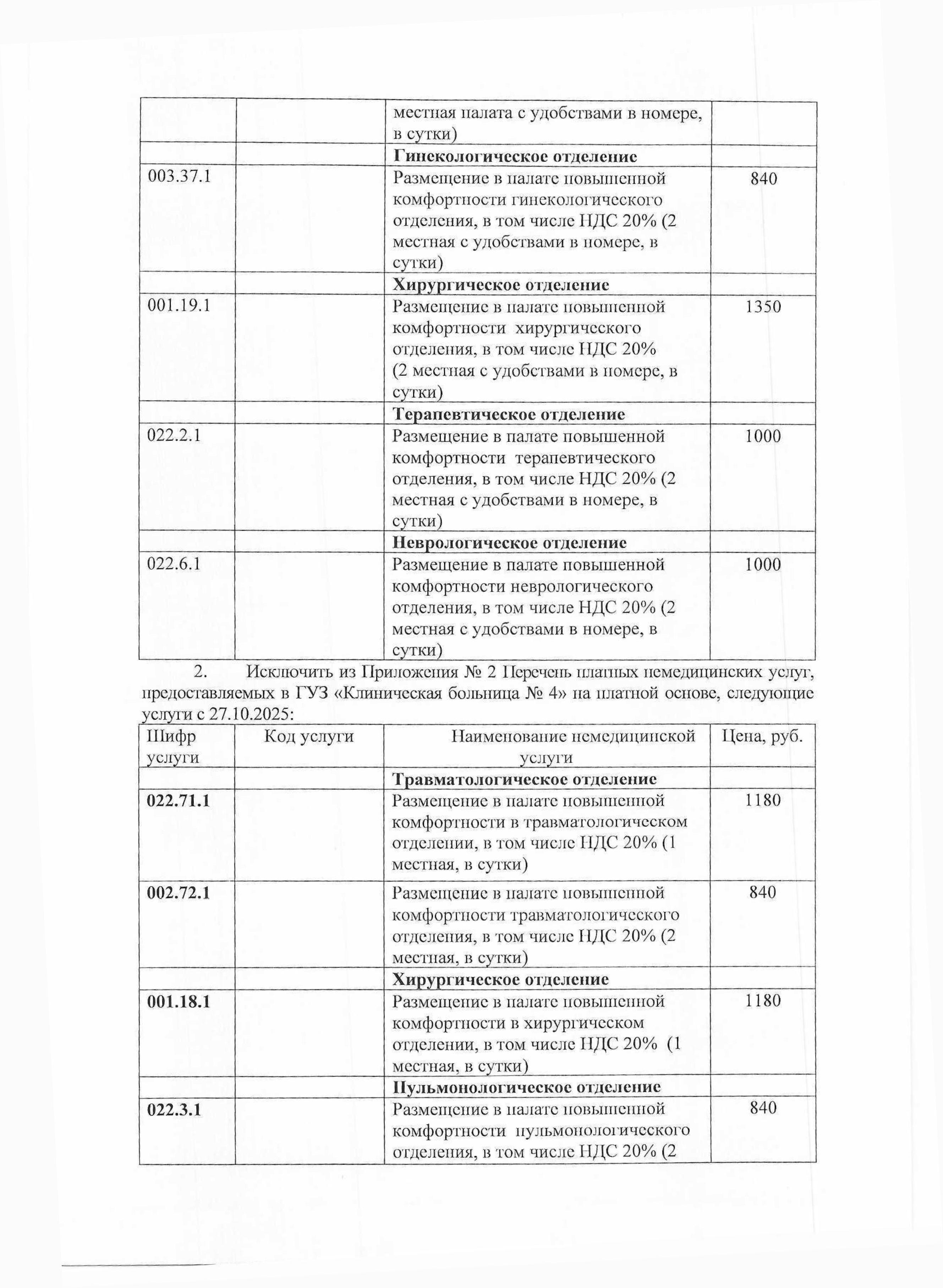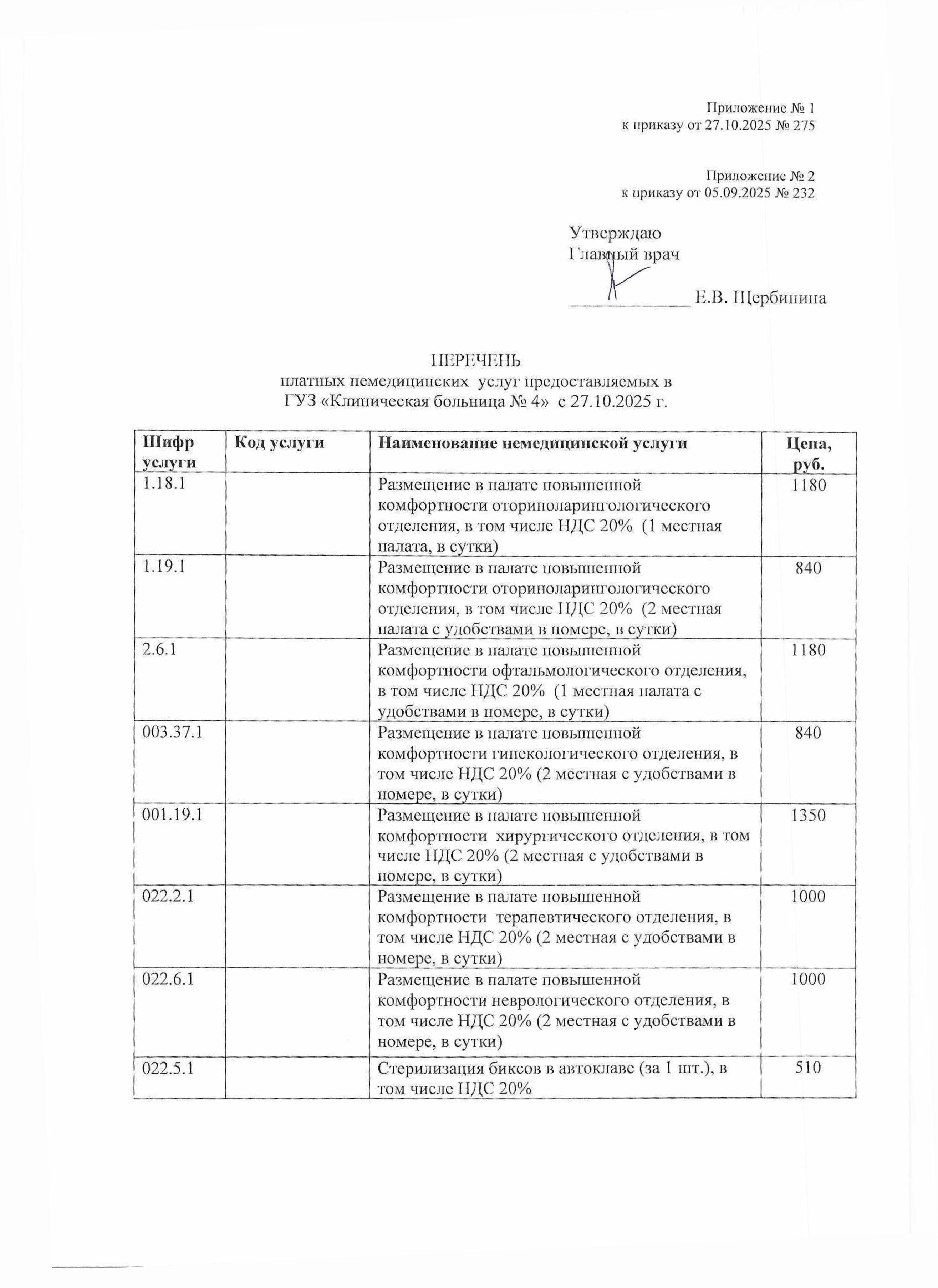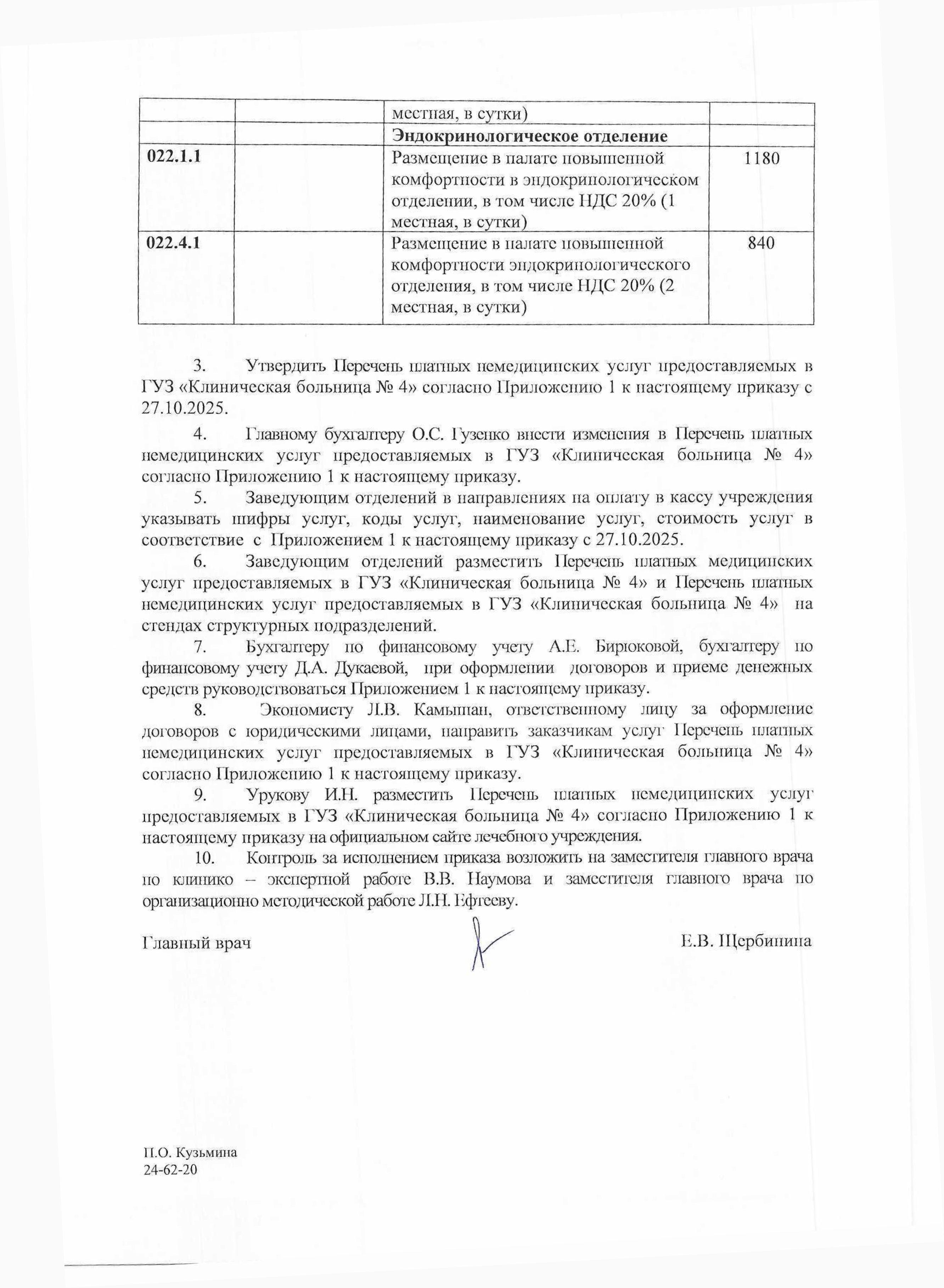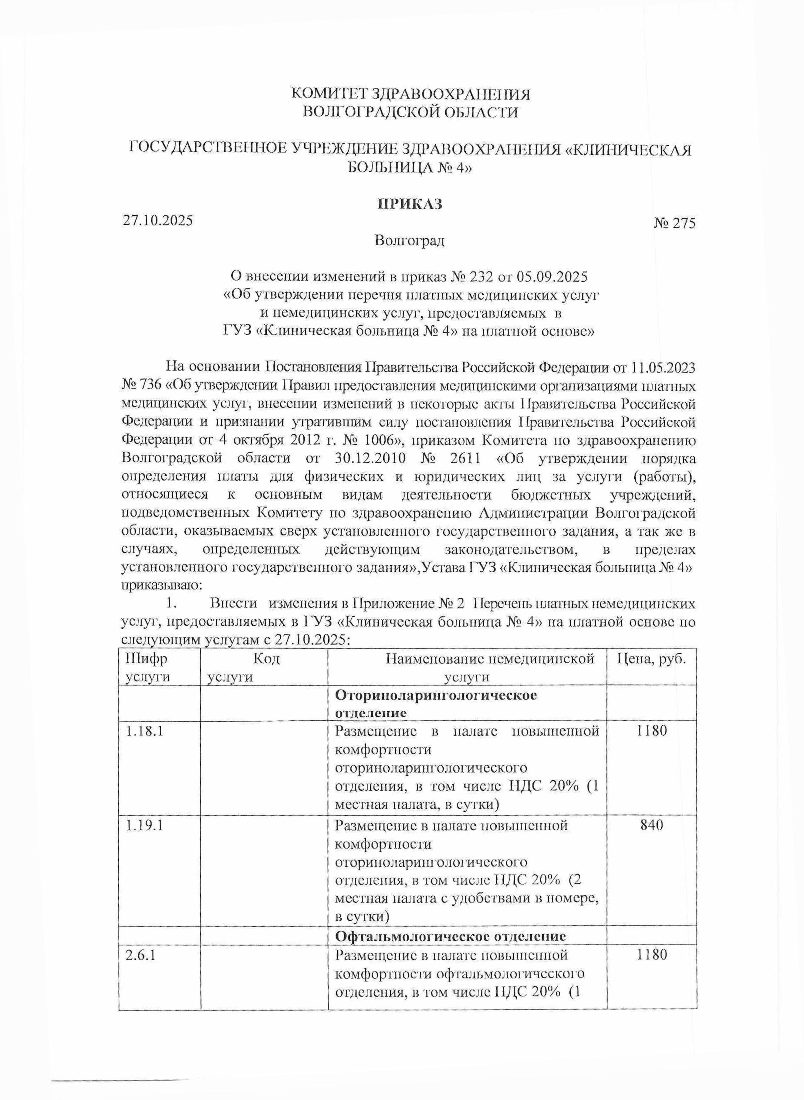 Приказ от 27.10.2025 № 275 «О внесении изменений в приказ № 232 от 05.09.2025 «Об утверждении перечня платных медицинских услуг и немедицинских услуг, предоставляемых в ГУЗ «Клиническая больница № 4″ на платной основе».